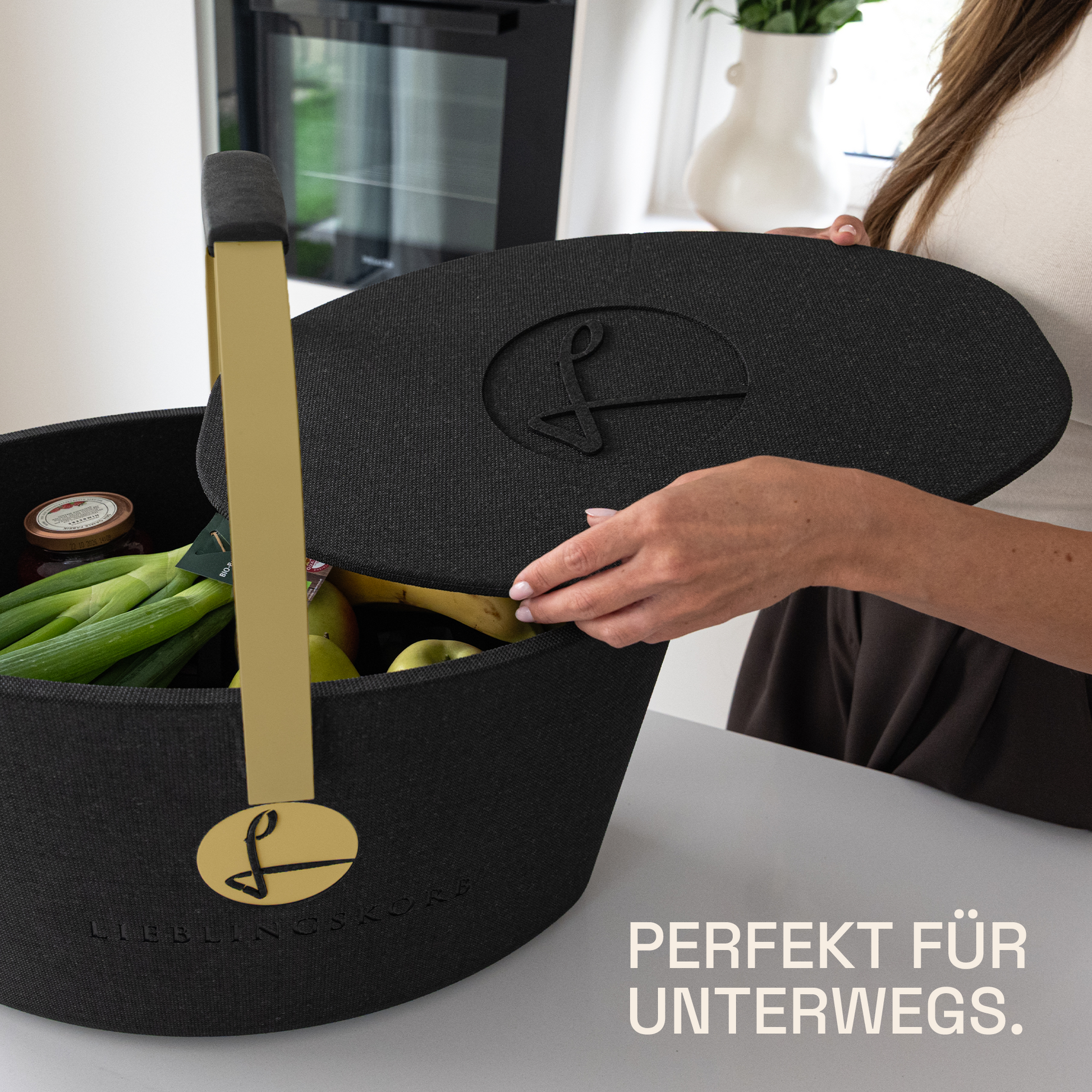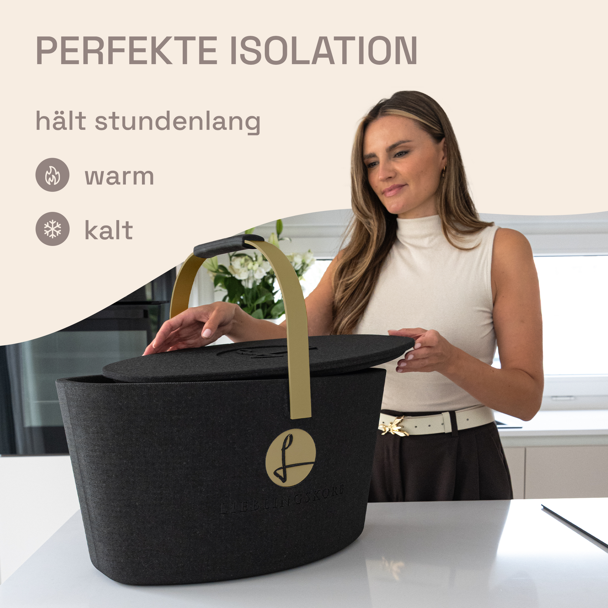 Der LIEBLINGSKORB Basic ist dank der ovalen Form ein echtes Platzwunder. Dieser Einkaufskorb in stilvollem deep black ist gemacht für alles, was dein Alltag bereithält. Dank der kippsicheren, formstabilen Konstruktion transportierst du deine Lebensmittel sicher und entspannt – selbst bei voller Beladung. Das thermoisolierende Material sorgt dafür, dass frische Lebensmittel länger kühl bleiben.