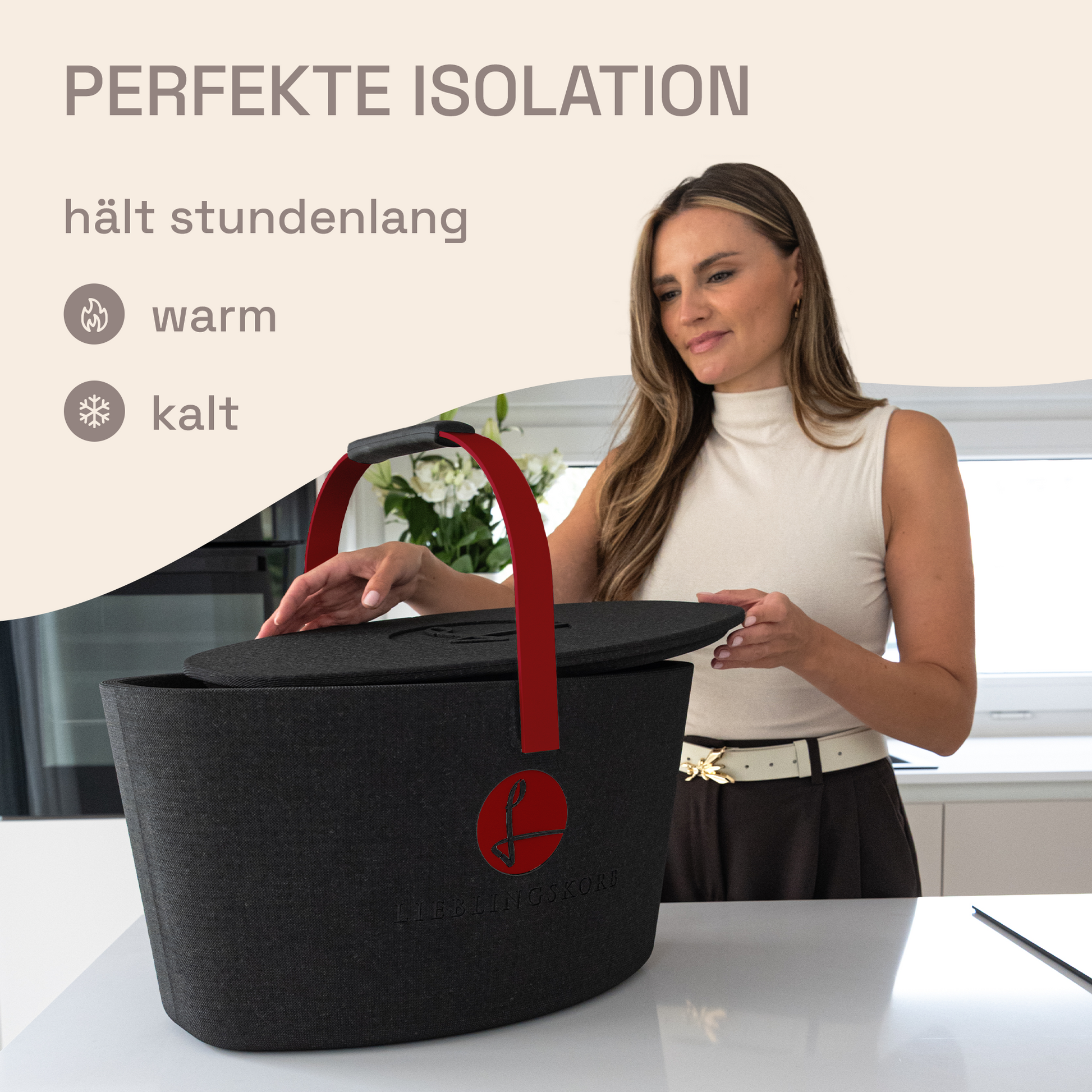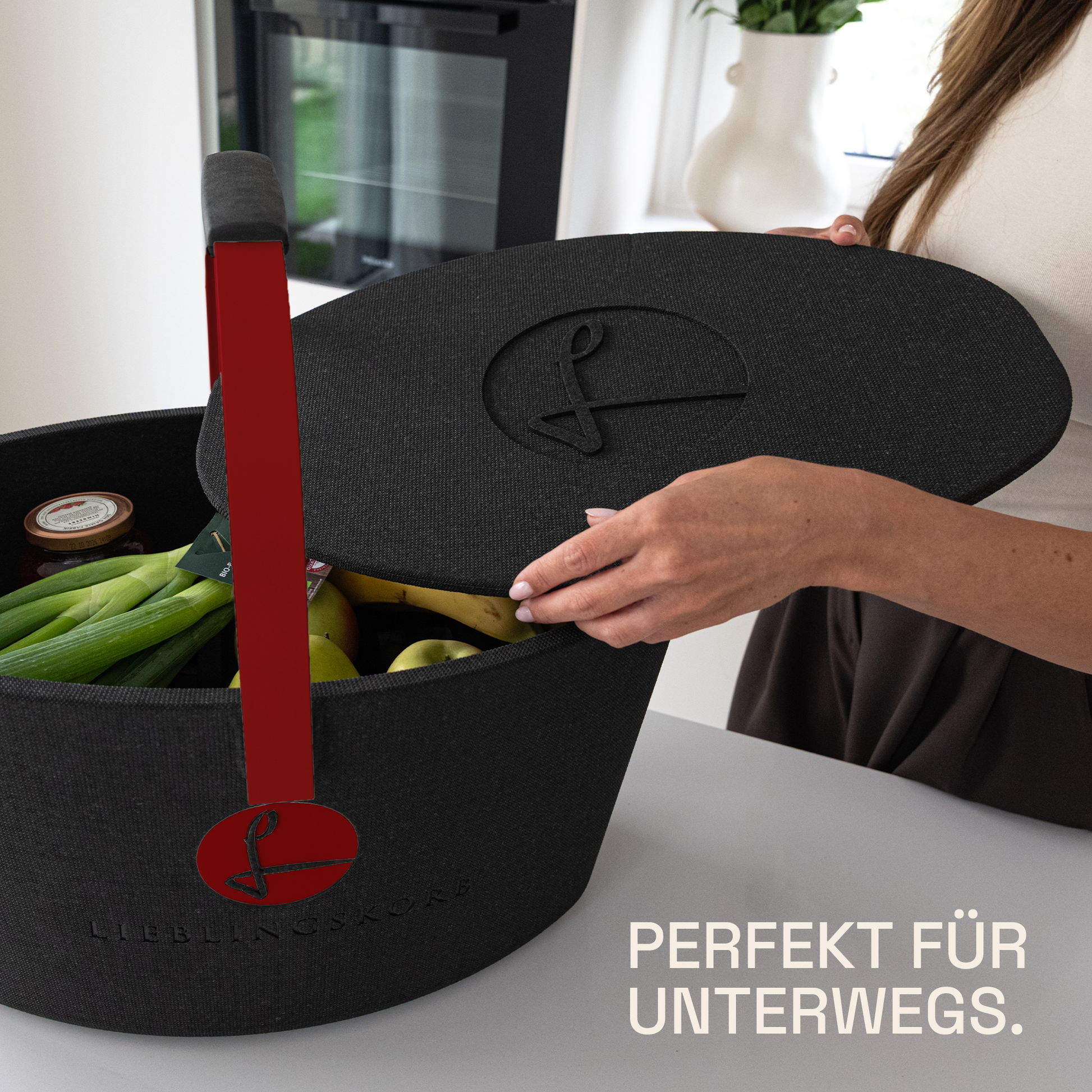Der LIEBLINGSKORB Basic ist dank der ovalen Form ein echtes Platzwunder. Dieser Einkaufskorb in stilvollem deep black ist gemacht für alles, was dein Alltag bereithält. Dank der kippsicheren, formstabilen Konstruktion transportierst du deine Lebensmittel sicher und entspannt – selbst bei voller Beladung. Das thermoisolierende Material sorgt dafür, dass frische Lebensmittel länger kühl bleiben.