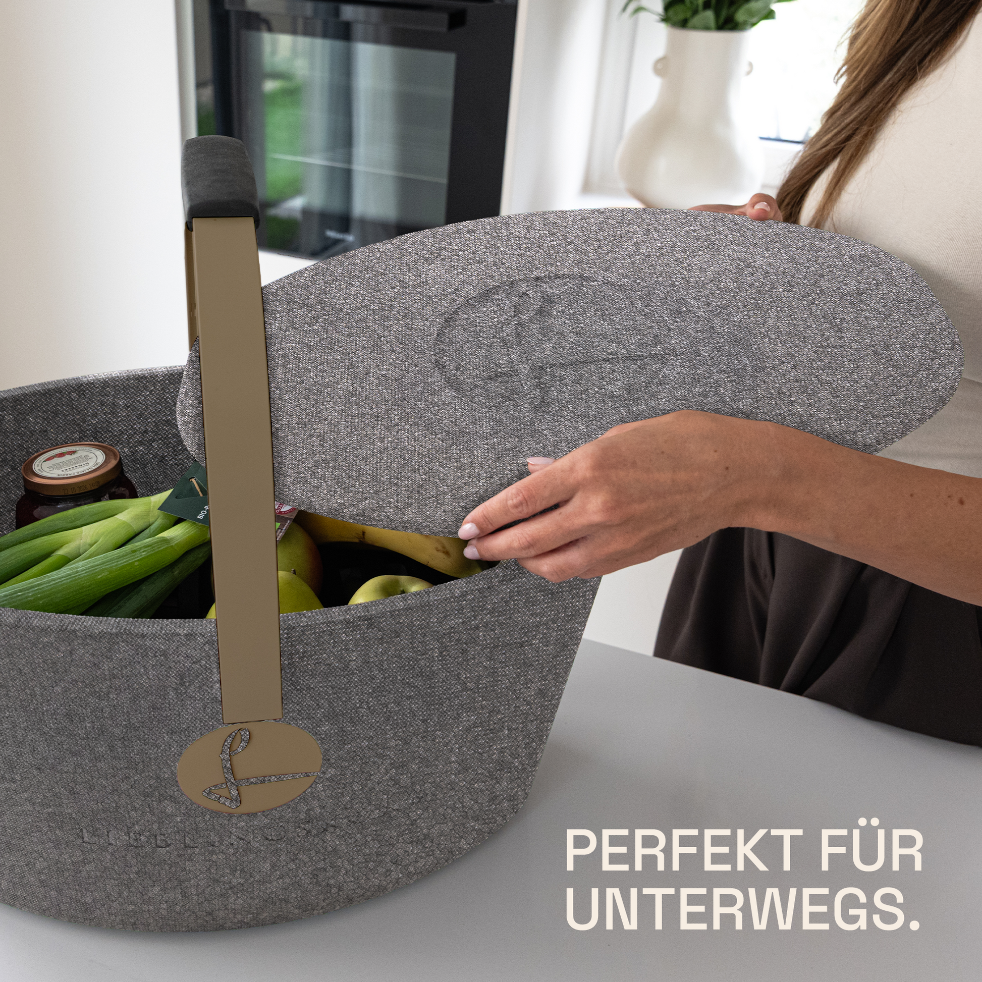 Der LIEBLINGSKORB Basic ist dank der ovalen Form ein echtes Platzwunder. Dieser stilvolle Einkaufskorb ist gemacht für alles, was dein Alltag bereithält. Dank der kippsicheren, formstabilen Konstruktion transportierst du deine Lebensmittel sicher und entspannt – selbst bei voller Beladung. Das thermoisolierende Material sorgt dafür, dass frische Lebensmittel länger kühl bleiben.