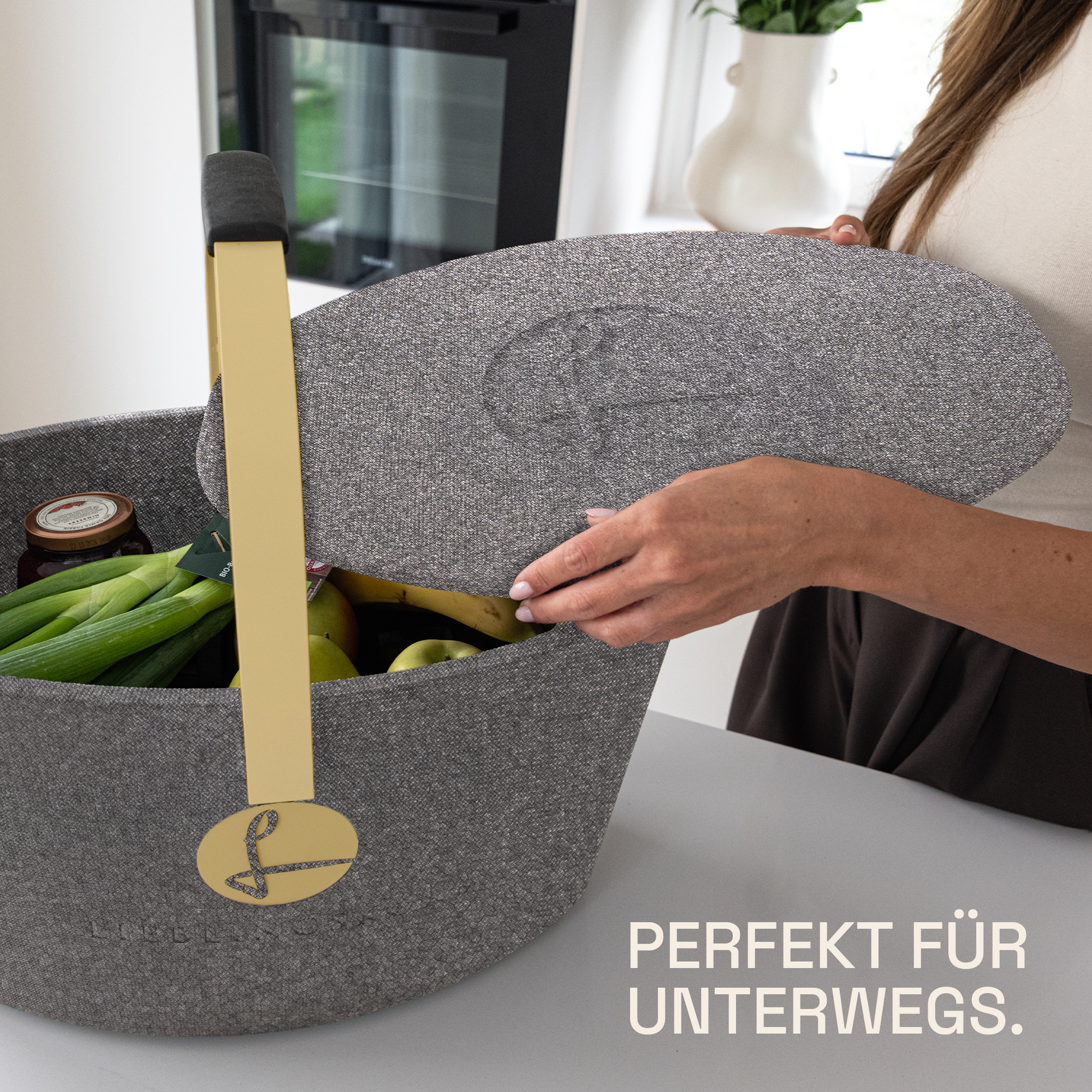 Der LIEBLINGSKORB Basic ist dank der ovalen Form ein echtes Platzwunder. Dieser stilvolle Einkaufskorb in silver grey ist gemacht für alles, was dein Alltag bereithält. Dank der kippsicheren, formstabilen Konstruktion transportierst du deine Lebensmittel sicher und entspannt – selbst bei voller Beladung. Das thermoisolierende Material sorgt dafür, dass frische Lebensmittel länger kühl bleiben.