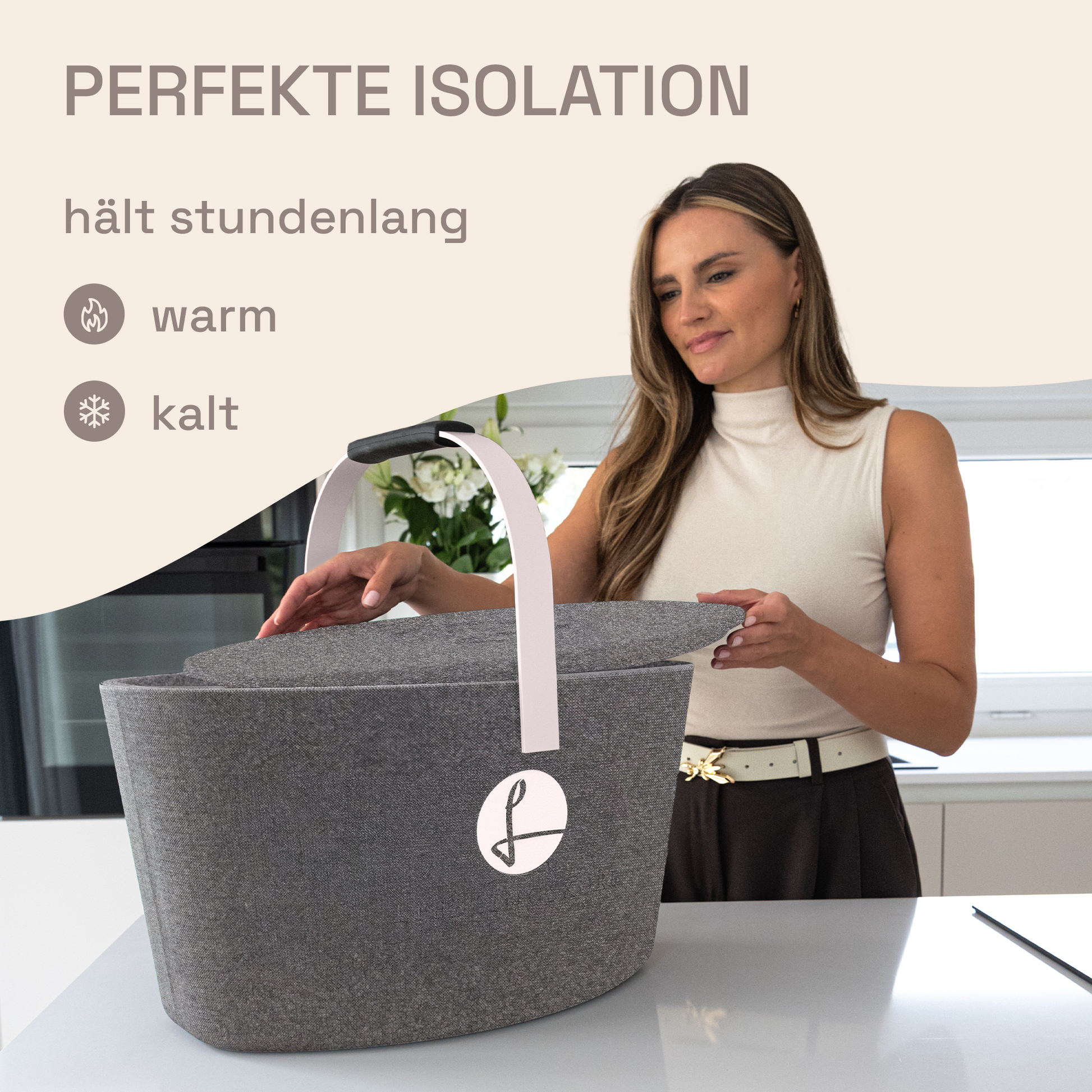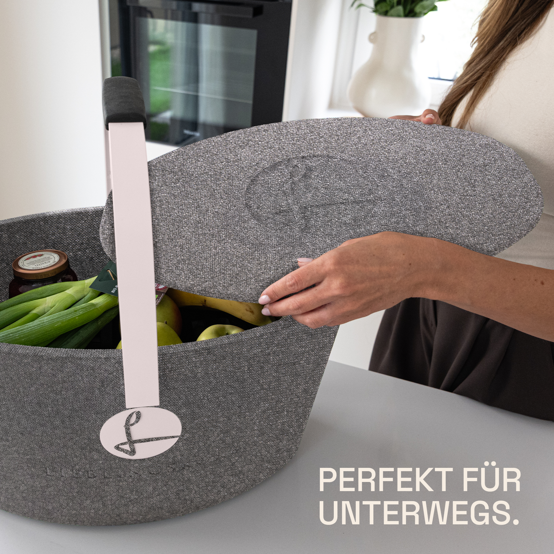 Der LIEBLINGSKORB Basic ist dank der ovalen Form ein echtes Platzwunder. Dieser stilvolle Einkaufskorb ist gemacht für alles, was dein Alltag bereithält. Dank der kippsicheren, formstabilen Konstruktion transportierst du deine Lebensmittel sicher und entspannt – selbst bei voller Beladung. Das thermoisolierende Material sorgt dafür, dass frische Lebensmittel länger kühl bleiben.