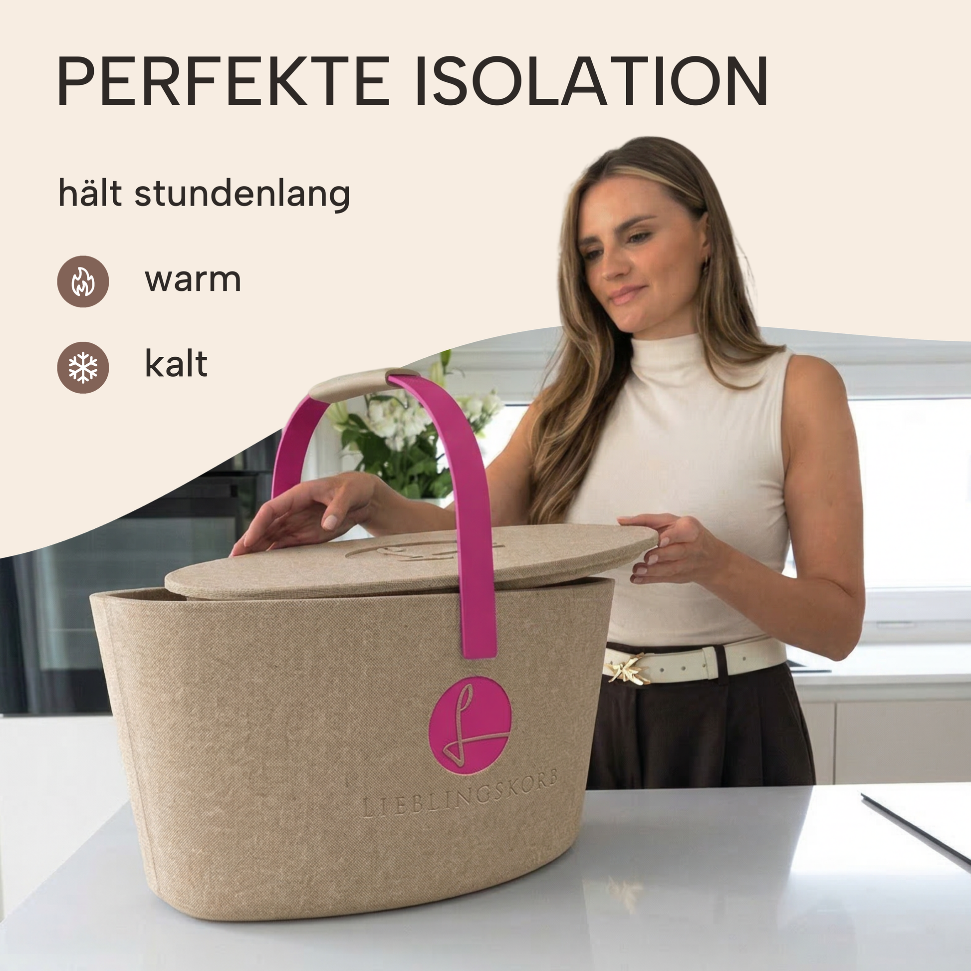 Der LIEBLINGSKORB Basic ist dank der ovalen Form ein echter Alltagsheld. Dieser stilvolle Einkaufskorb ist gemacht für alles, was dein Alltag bereithält. Dank der kippsicheren, formstabilen und ultraleichten Konstruktion transportierst du deine Lebensmittel sicher und entspannt – selbst bei voller Beladung. Das thermoisolierende Material sorgt dafür, dass frische Lebensmittel länger kühl bleiben.